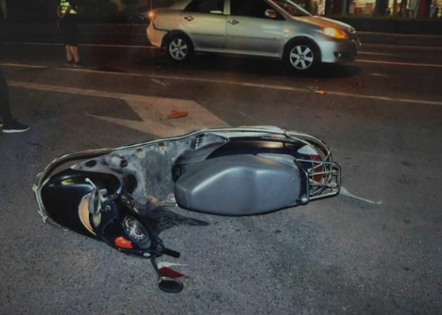 近日,余某驾驶二轮摩托车行经潮州市饶平县某路口时,撞向前方正在等待红灯的小轿车,事故造成余某受伤及两车受损。