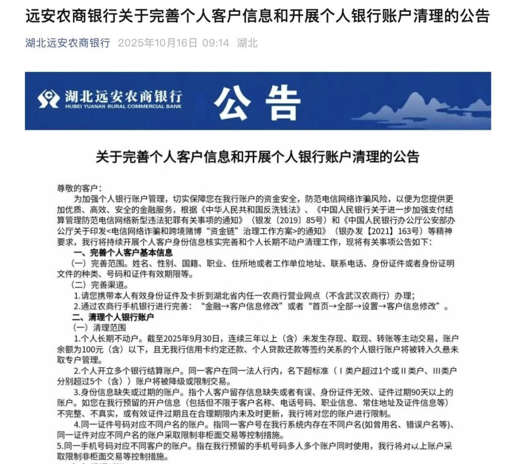 10月16日,湖北远安农商银行发布公告明确,将开展个人银行账户清理,包括个人长期不动户、个人开立多个银行结算账户、身份信息缺失或过期的账户。