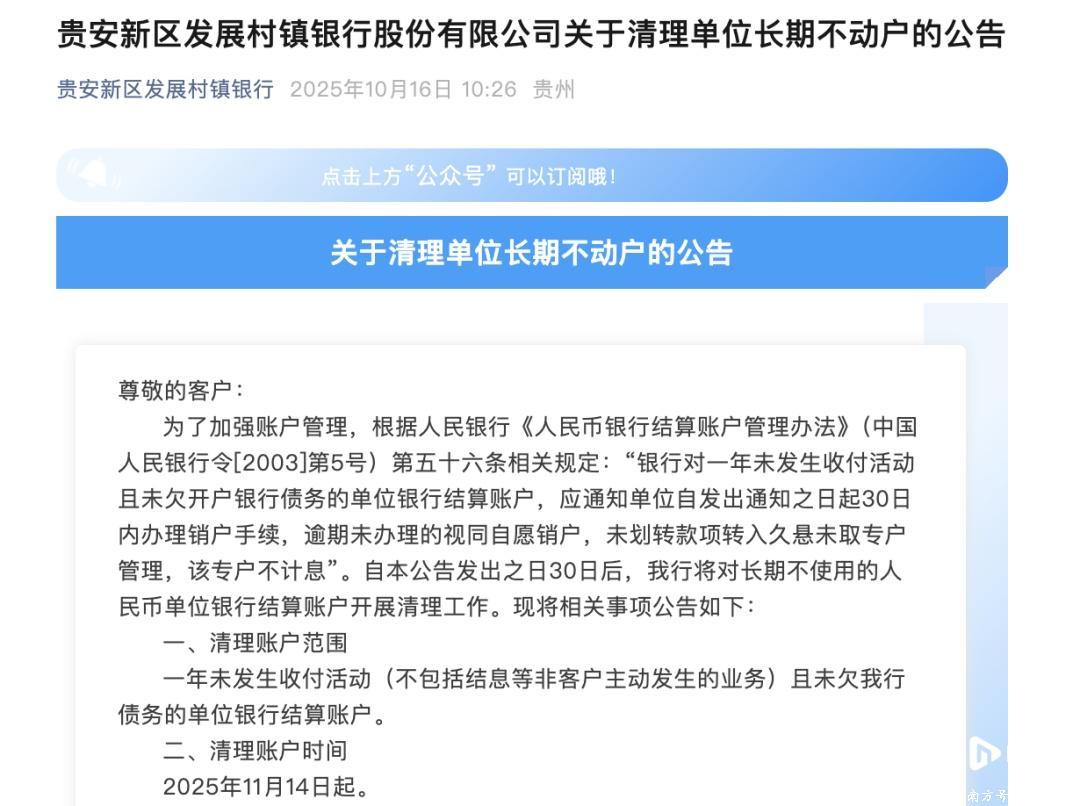 同日,贵安新区发展村镇银行公告称,将对一年内未发生收付活动(不包括结息等非客户主动发生的业务)且未欠该行债务的单位银行结算账户进行清理。