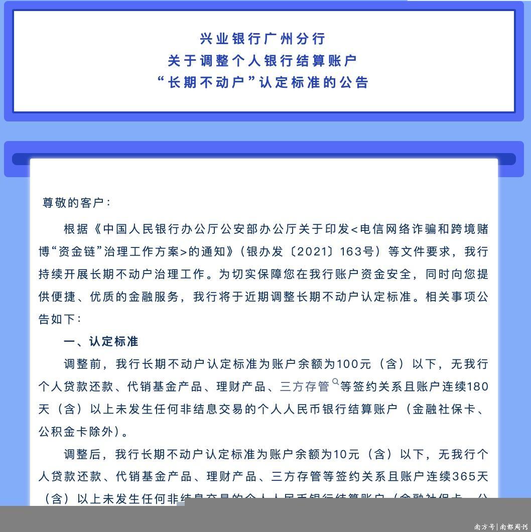 10月13日,兴业银行发布公告称,调整前,该行长期不动户认定标准为账户余额100元(含)以下,无该行个人贷款还款、代销基金产品、理财产品、三方存管等签约关系且账户连续180天(含)以上未发生任何非结息交易的个人人民币银行结算账户(金融社保卡、公积金卡除外)。